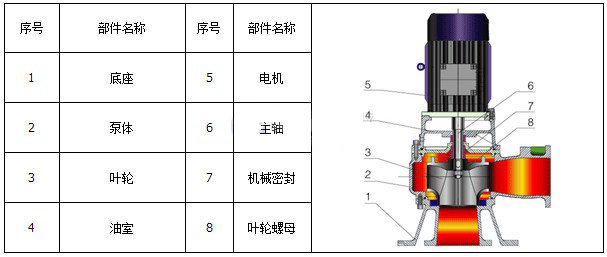 本泵系單級(jí)單吸立式離心泵,主要部件有蝸殼、葉輪、泵座、泵殼、支撐筒、電機(jī)座、電動(dòng)機(jī)等組成。蝸殼、泵座、電機(jī)座、葉輪螺母是生鐵鑄造、耐腐性、耐腐蝕性較好,加工工藝方便。